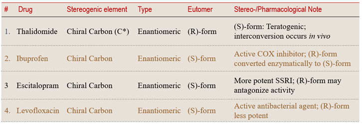 Carbon-based chirality remains the most widely encountered and pharmaceutically significant form of stereochemical differentiation. The following examples illustrate how a single chiral carbon can transform molecular identity, potency, and safety profile.