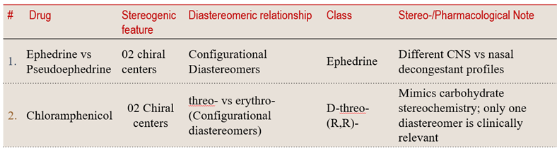 This structural feature is seen in chiral molecules like ephedrine vs pseudoephedrine or the antibiotic Chloramphenicol, where subtle stereochemical changes create clinically distinct profiles.