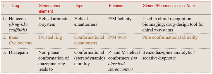 Shape can be the stereocenter. When folding or helical geometry prevents mirror-image overlap, a molecule becomes chiral without needing a classical stereogenic atom. True conformational enantiomers are rare in drugs, but foundational in probe chemistry & modern chiral scaffold design.