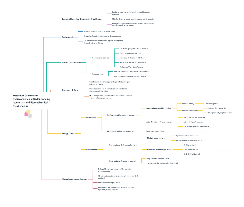 This map decodes how subtle spatial changes transform molecular identity, guiding efficacy, safety, and selectivity in pharmaceuticals. It explores the interplay of isomerism, chirality, symmetry, and energy criteria in shaping a molecule’s therapeutic or toxic potential.