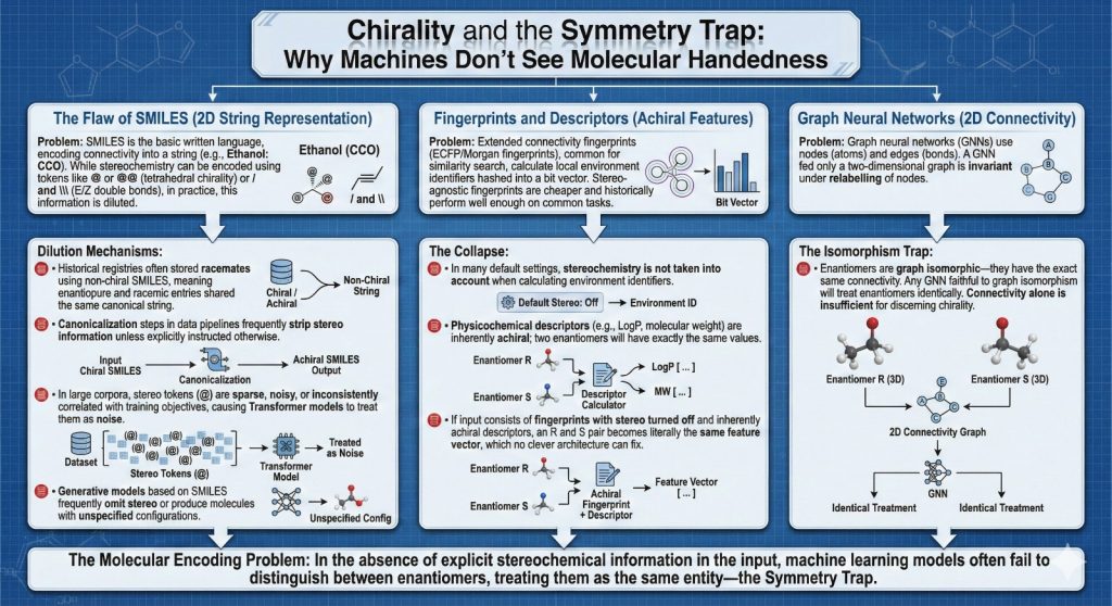 The first episode argued that many AI models in drug discovery are effectively blind to molecular handedness. This one explains why in more detail. We look at how molecules are encoded as SMILES strings, fingerprints, two dimensional graphs and three dimensional coordinates. At each stage we identify where stereochemical information is lost or blurred. Then we look at common architectures, especially graph neural networks, SMILES Transformers and geometric deep learning models, and explain why many of them are reflection invariant by design. The result is slightly ironic. The models are doing exactly what we asked them to do. The mistake lies in the question we posed.