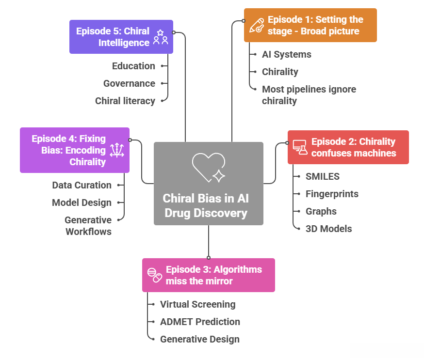 This first episode introduces the idea of chiral bias in AI driven drug discovery. We look at what chirality is, why it matters so much in pharmacology, and how our current data and representations allow AI to learn chemistry without really learning stereochemistry. The later episodes pick up from here and follow the consequences through screening, Absorption, Distribution, Metabolism, Excretion, and Toxicity (ADMET), and generative design, then into possible fixes and broader cultural questions.
