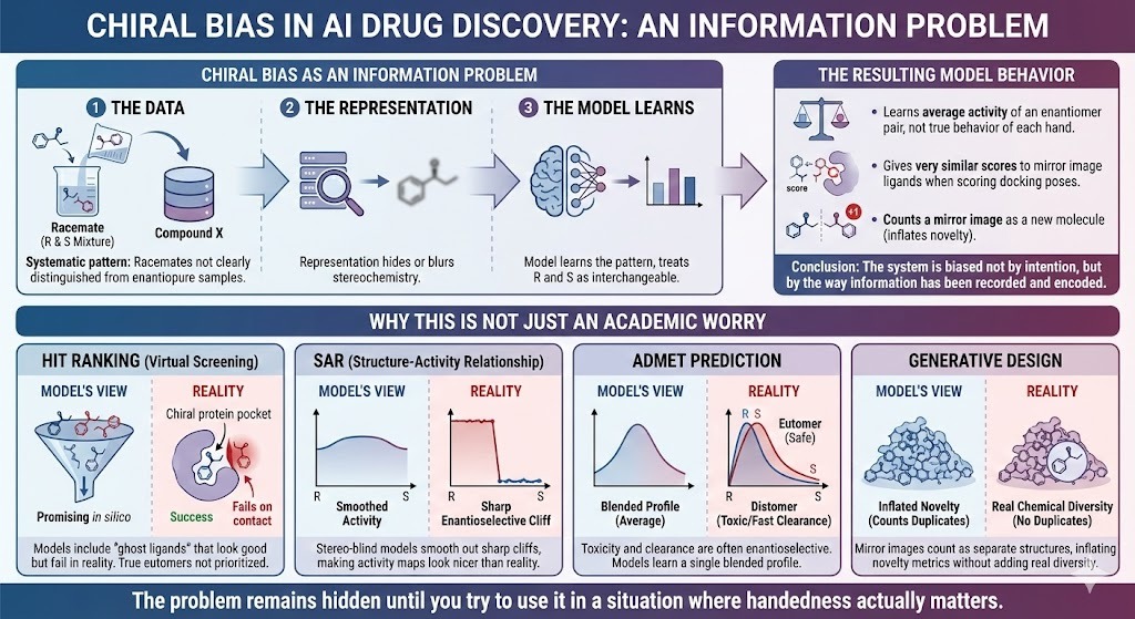 This is what we mean by chiral bias in AI drug discovery. The system is biased not by intention, but by the way information has been recorded and encoded.