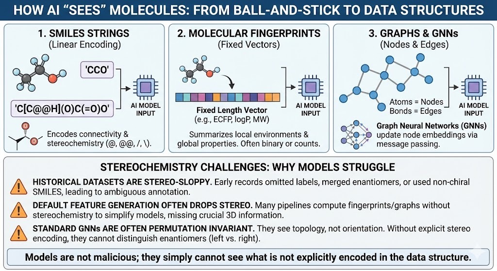 Medicinal chemists are used to thinking in terms of eutomer, distomer and chiral switch. They know that the three dimensional arrangement of atoms can be the difference between a blockbuster and a disaster. So far, this is standard stereochemistry. The trouble starts when this three dimensional reality is turned into the inputs that AI systems actually consume.