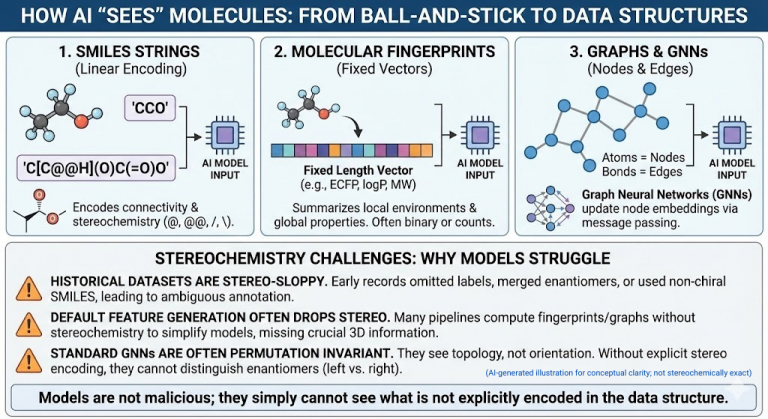“When algorithms forget the mirror, molecules lose their meaning” On Visuals and Stereochemical TruthSome illustrations in this series are generated or assisted by AI to support conceptual understanding. These visuals are intentionally simplified and should not be read as stereochemically rigorous or chemically exact representations. Wherever stereochemical fidelity matters, it is addressed explicitly in the discussion—because in chemistry, especially in chiral systems, intuition must always yield to structure. Artificial intelligence is now everywhere in drug … Continue reading Episode 1: The Promise and the Paradox: AI That Miss the Mirror