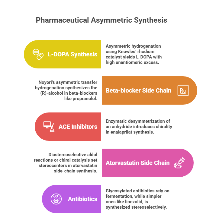 - Atorvastatin (Lipitor): Synthesis of its side-chain (a dihydroxyheptanoic acid) initially involved diastereoselective aldol reactions (with Evans auxiliary) to set the two stereocenters. Later processes used chiral catalysis or biocatalysis to avoid auxiliary.