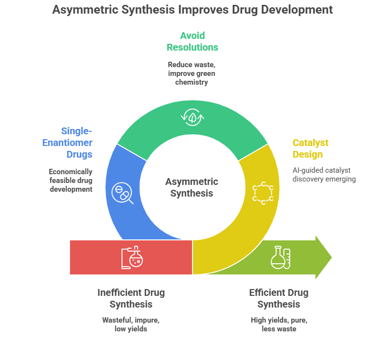 Asymmetric synthesis strategies also tie into “green chemistry”. Stereoselective methods, especially catalytic ones, avoid the waste of resolving racemates (which at best give 50% yield of desired enantiomer unless the other enantiomer can be racemized and recycled – a process called dynamic kinetic resolution). Many pharma companies strive to implement asymmetric catalysis or biocatalysis early in synthesis to maximize yield of the correct stereoisomer and minimize extra steps. This points to a future where more drug syntheses will employ enzyme catalysts or well-designed organometallic/organocatalysts for stereocontrol.