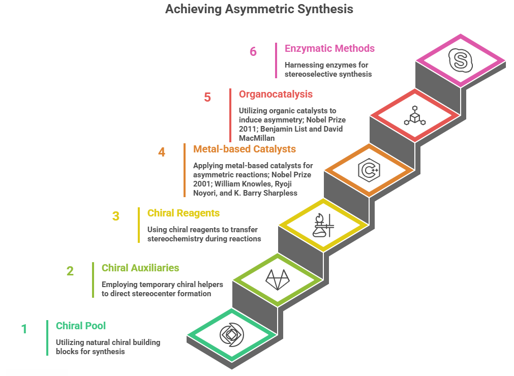 - Chiral pool and chiral auxiliaries – using existing chirality from nature or temporary stereocontrolling groups.