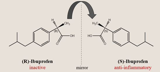Among over-the-counter drugs, ibuprofen is perhaps the best-known case of chiral metabolism. It is marketed as a racemate, but only the S-(+)-enantiomer inhibits cyclooxygenase (COX) enzymes and relieves pain.