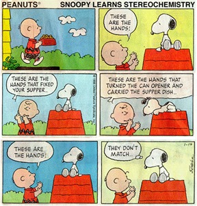 # Source Attribution: Peanuts © 1950–2000 Peanuts Worldwide LLC. Used here for educational purposes (stereochemistry analogy). All rights reserved to the original copyright holders.